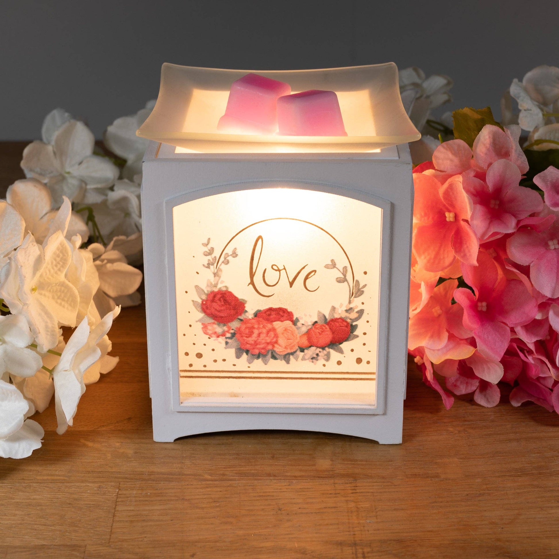 Set the mood with this Valentine's Day themed wax warmer. Sit back, relax, and enjoy. Wax sold separately. Materials: Wood, Glass Dish Material: Glass Bulb Type: 25 watt Cord Color: Black Super Easy Setup: * Install light bulb (included) * Choose from a variety of wax fragrances (sold separately) * Place 1-2 wax cubes in the dish * Plug into a 120VAC electrical outlet * Turn the warmer on * Enjoy long-lasting fragrance - Brown box packaging,