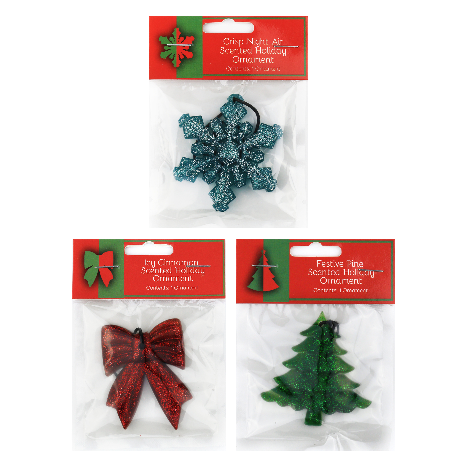 Add a fragrant atmosphere to your holidays by hanging Scented Holiday Ornaments on your tree, wreath, or anywhere you want the familiar scents of fresh pine, icy cinnamon, and crisp night air. The Festive Pine Tree Scented Holiday Ornament smells like a fresh-cut Christmas tree! Put yourself in the holiday mood with the aroma of a Christmas tree farm at the beginning of December. The Icy Cinnamon Ribbon Scented Holiday Ornament smells like fresh-made cinnamon cookies or the familiar aroma of a home decor store at Christmas time! The Crisp Night Air Snowflake Scented Holiday Ornament smells like a breath of fresh, crisp air, infused into each scented holiday ornament. Product Features: • 3 festive holiday fragrances • Elastic cord for easy hanging • Fragrance will last throughout the holiday season